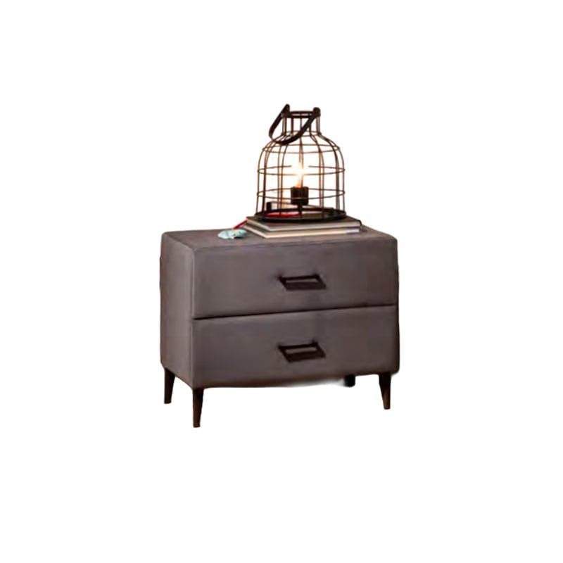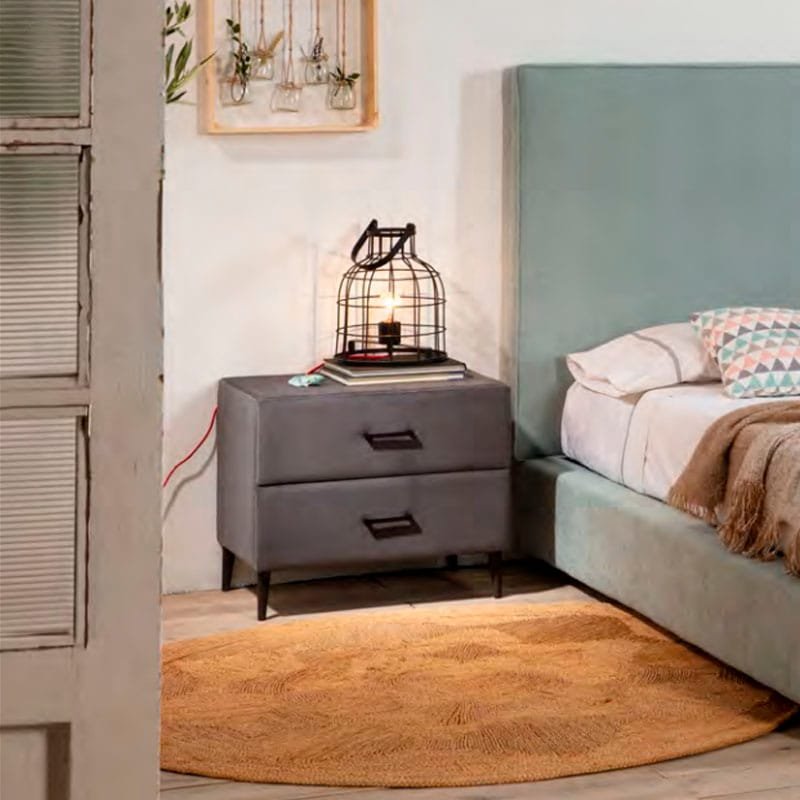 La mesa de noche TACON, es una mesa robusta, tapizada en tela. Sus 2 amplias gavetas permiten almacenar lo necesario para su comodidad y sus patas altas permiten el paso de los robots de limpieza.